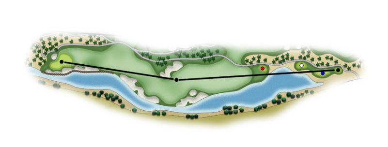 This is a strong par 4 with water all the way down the left side. Long collection bunkers along the water’s edge have been located in strategic locations to separate water from fairway. Two very good shots will be required to reach the green in two.