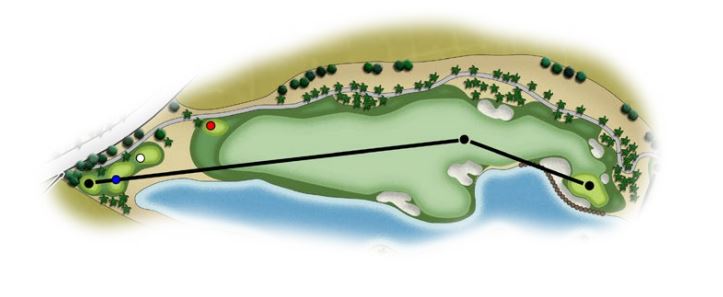 This is a medium length par 4 with a double fairway. Tee shots down the right side have more water to contend with than the left side, but provide players with a better green angle to approach over water. Numerous bunkers and a “side-on” green angle make an approach from the left more challenging.