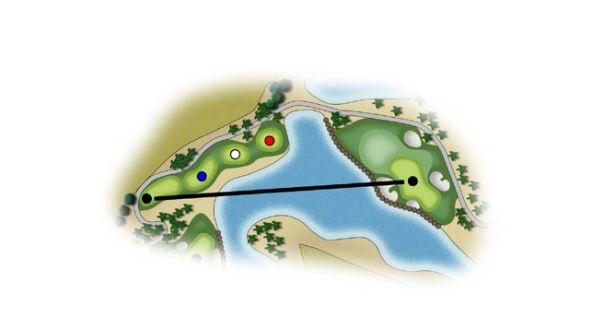 This strong par 3 finishing hole has a forced water carry and water right of green. Bail out is short left and the back right pin is well protected by bunkering and water.